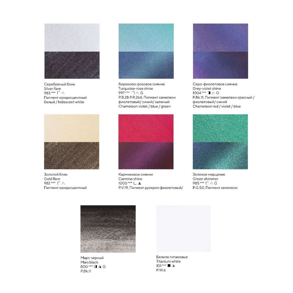 Conheça a edição limitada da coleção cintilante de aquarelas artísticas extrafinas White Nights. As cores complementam a linha de cores primárias da série. Podem ser usadas para destacar, adicionar saturação e brilho à obra e criar efeitos decorativos adicionais. O nome das cores reflete as propriedades das partículas cintilantes na composição – “Flare”, “Shimmer”, “Glow”, “Shine” são divididas por tamanho e gradação de iridescência.