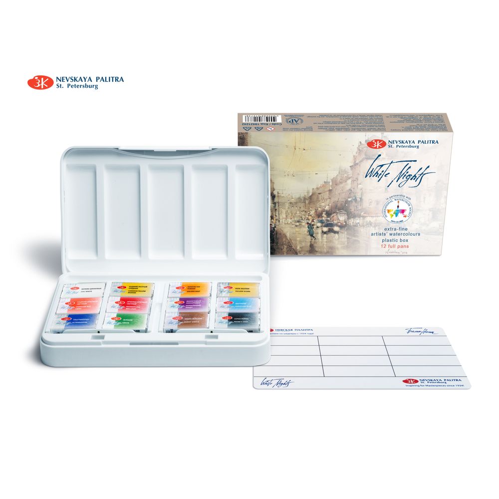 Kit com 12 cores, aquarela profissional importada White Nights em pastilha full pan.